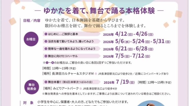“ 緑区で「暮らす」 ” ゆかたを着て、舞台で踊る本格体験「はじめての日本舞踊体験講座」開催![緑・芸術文化活動支援事業] 2026年4月5日 ぐりすま編集部 GREEN SMILE -ぐりすま-|緑区がもっと好きになる!