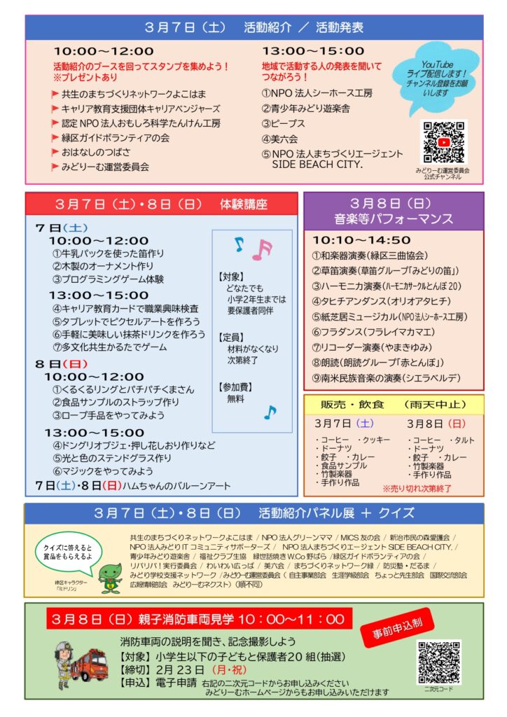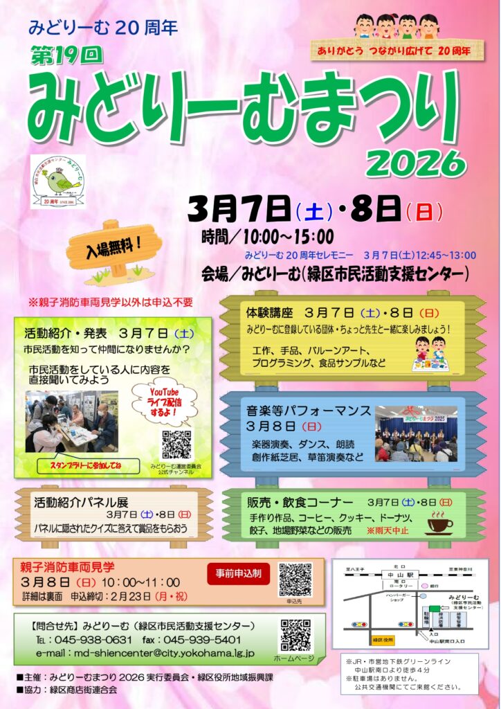 2026年3月7日・8日にみどりーむ(緑区市民活動支援センター)にて「第19回みどりーむまつり2026」が開催されます!こちらのページでぜひイベント情報をチェックしていってください!